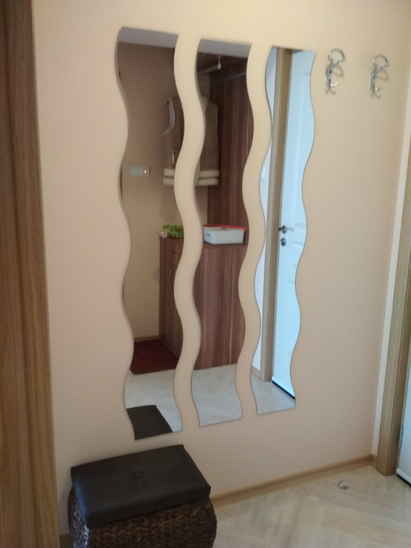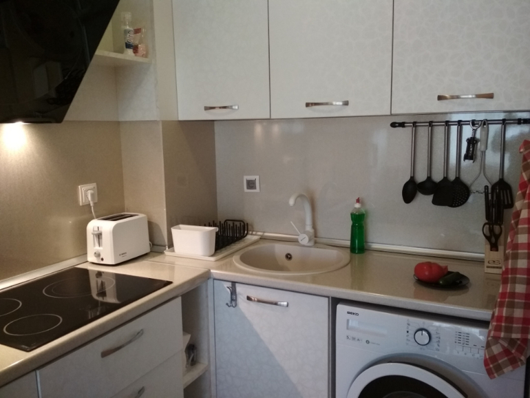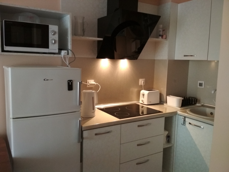 В квартире 2 комнаты - гостиная с мини-кухней и просторная спальня. В спальне большая 2-сп. кровать, есть место для детской кроватки. В гостиной угловой раскладной 2-сп. диван и еще раскладной полуторный. В Вашем распоряжении микроволновка, тостер, эл. плита, стиральная машина, телевизор, кондиционер. Есть утюг и гладильная доска, фен, вся необходимая посуда, постельное белье и полотенца. Если нужно, предоставим кроватку для малыша и стульчик для кормления. Если Вы с коляской - на территории никаких ступенек, проедете без проблем, лифт большой - коляска входит, не складывая, будить малыша не придется. Wi-Fi в холле отеля без дополнительной платы, в номере можно за отдельную плату.