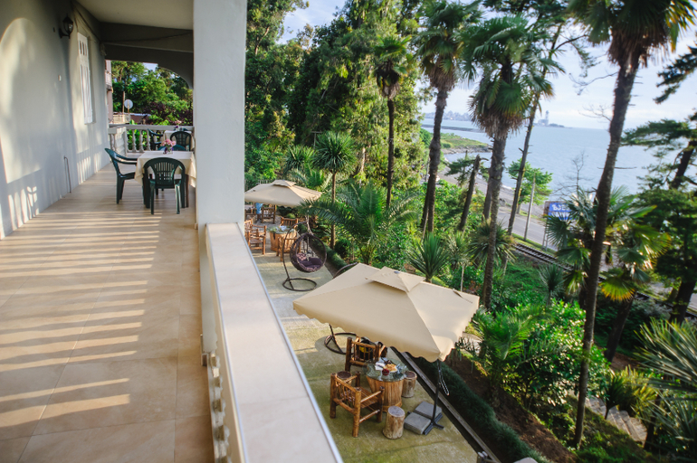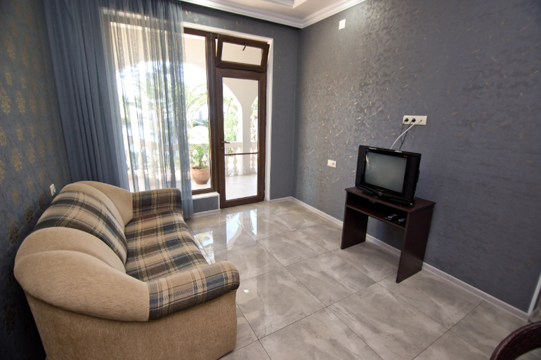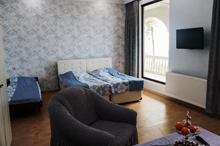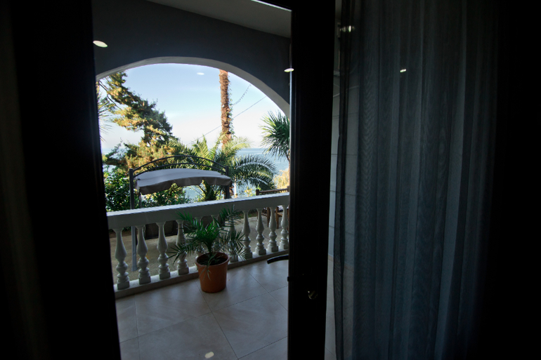 Дом вмещает до 34 человек, есть соседний дом с вместимостью до 12 человек (3 этажа, на каждом по двухкомнатном номеру с отдельной кухней, туалетом, ванной и балконом, из всех номеров вид на море.