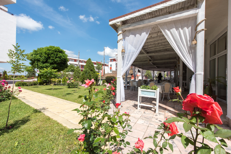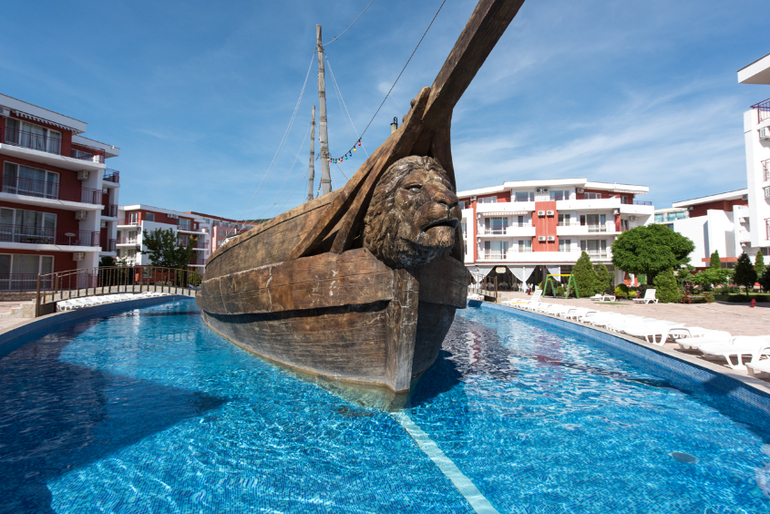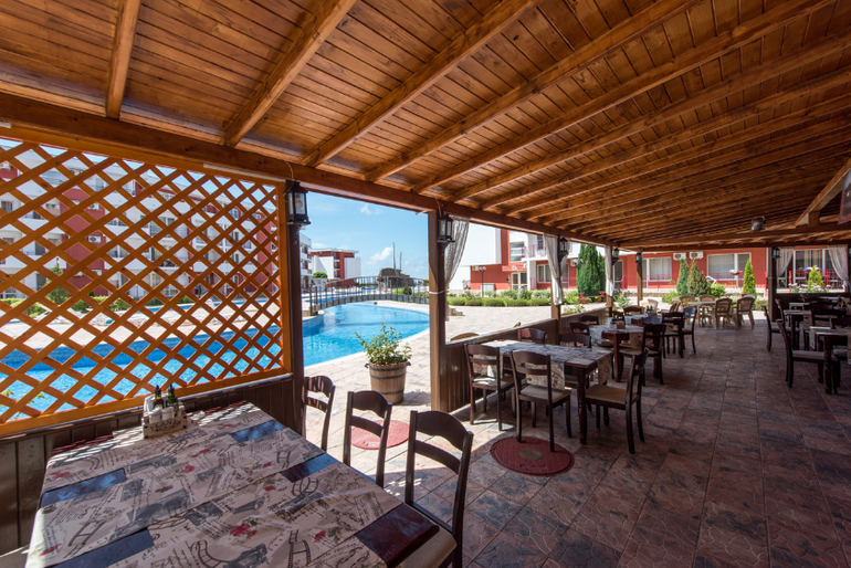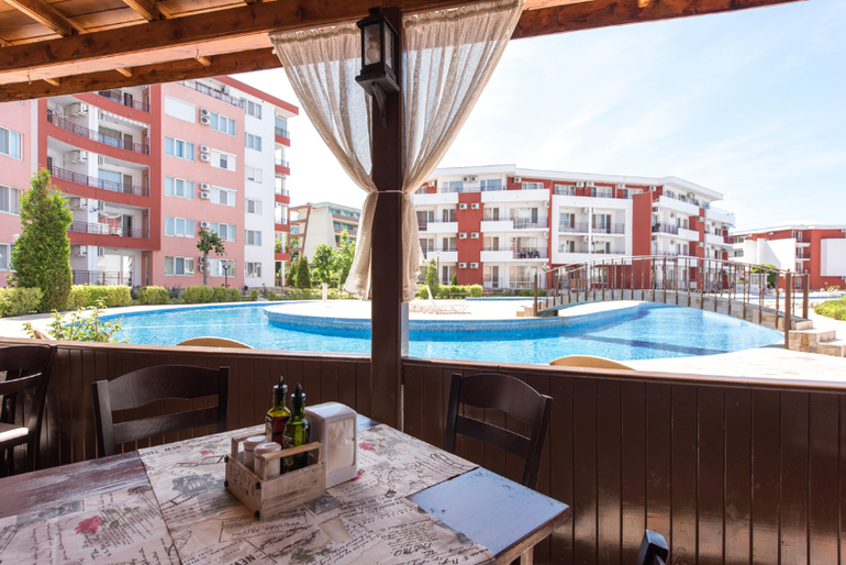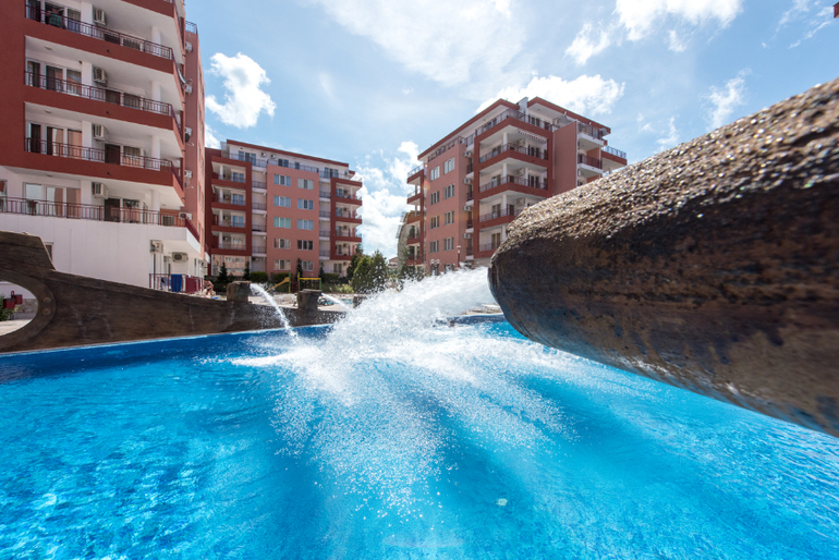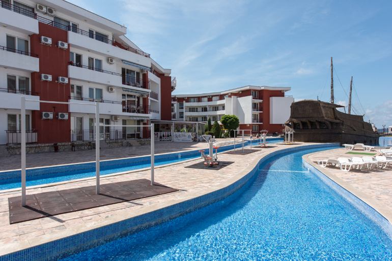 3 бассейна, рестораны, магазины, салон красоты рядом большой супермаркет, аквапарк. Ходят автобусы до Солнечного Берега.