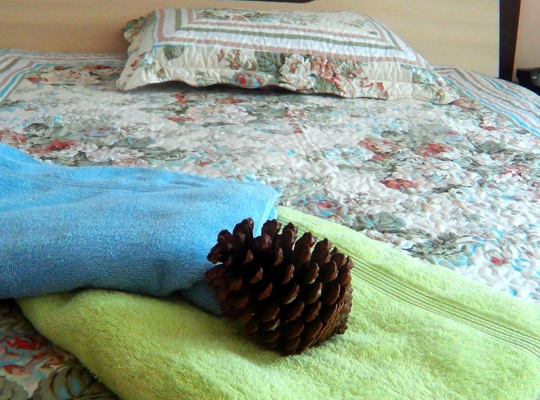В вашем распоряжении будет двухкомнатная квартира (просторная гостиная + кухня и спальня) на втором этаже. В спальне двуспальная кровать и раскладной диван, в гостиной раскладной, угловой диван. Несколько комплектов постельного белья и полотенца. Кухня полностью оснащена необходимой техникой (холодильник, СВЧ, стиральная машина и т.д.) и посудой.