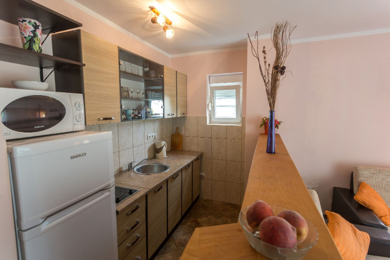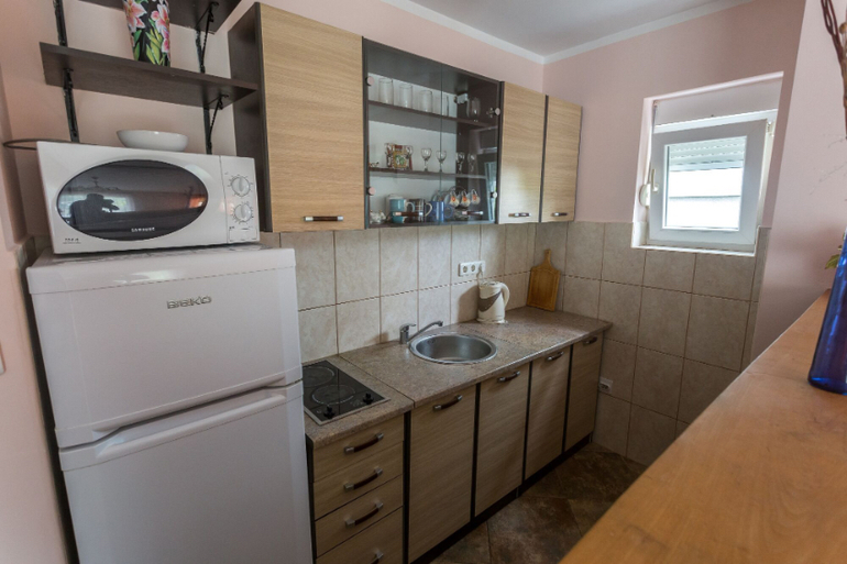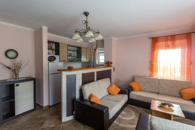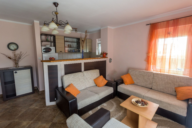 Апартамент двухкомнатный (гостиная + спальня). В гостиной есть раскладывающийся в двуспальную кровать диван. Выход во дворик-террасу с барбекю. Квартира расположена таким образом, что одной стеной граничит с другой квартирой, а с 3-х сторон расположен участок. Это очень удобно для отдыха с детьми - им есть где побегать, и есть место где оставить коляску, велосипед (есть две штуки) или просто посидеть.
