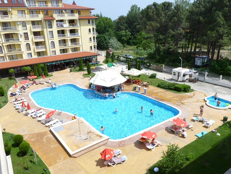 Апартаменты с 2 спальнями с видом на бассейны !! На 3-м этаже: прихожая, гостиная, 2 спальни, 2 террасы, 2 ванные комнаты. Кондиционеры в каждой комнате. Прихожая. Ванная комната с душем. Гостиная: раздвижной диван, кресло, стол, стулья, телевизор. Кухня: стиральная машина, холодильник, эл.плита с духовкой, микроволновая печь, эл.чайник, посуда. Большая терраса с Видом на бассейны и зеленые лужайки комплекса !! 1-я спальня: 2 односпальные кровати, гардероб, тумбочки. 2-я спальня: двуспальная кровать, гардероб, тумбочки. Ванная комната с душем. Из спален выход на террасу - вид на бассейны. Постельное белье, полотенца. Все комнаты раздельные - подходит для 2-х семей. В комплексе: - детская площадка, - бассейн детский, - бассейн взрослый, - бар у бассейна.