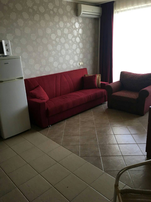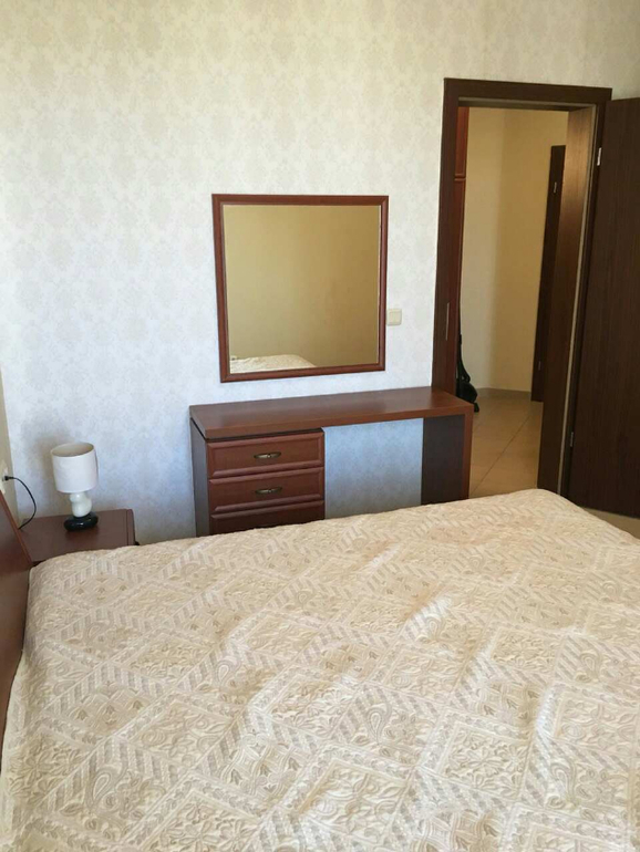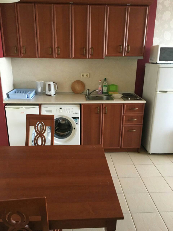 В гостиной: встроенная кухня (стиральная машина, большой холодильник, эл.плита, микроволновая печь, эл.чайник, посуда), раскладной диван, стол, стулья, телевизор, кондиционер. В спальне: 2-спальная кровать, гардероб, постельное белье, полотенца. Ванная комната с душем. Просторная терраса с Видом на бассейн. Коммунальные (ток, вода) входят в стоимость. Интернет Wi-Fi - платно - по тарифу комплекса.