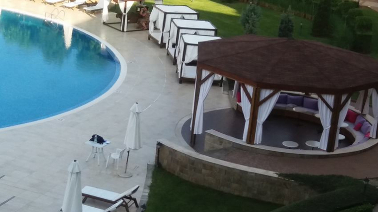 - Бассейны находятся в отдельных частях комплекса и имеют различную величину и форму. Возле каждого бассейна расположены шезлонги и зонты. Овальный бассейн имеет детскую секцию и шатёр для релакса или масажа.