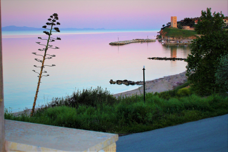 Пляж-крупный песок, не пыльный и не липнет к телу. На пляже есть лежаки и зонтики. Если занимаешь, просто надо сделат заказ в кафе. (минимально 6 евро за 2 лежака и зонтик)