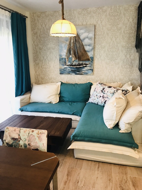 Греция, Халкидики, город Пефкохори. 90 км от аэропорта Салоники. 7 минут пешком до моря. Новые двухуровневые апартаменты, приобретены в 2018 году. Площадь 64 кВ. метра. Расположены в жилом комплексе с огороженной внутренней территорией. В квартире 2 спальни (1 двуспальная кровать и один двуспальный диван-кровать), кухня-гостиная (две односпальных кровати), 2 санузла, джакузи, 2 террасы с мебелью, в каждом помещении - кондиционер, кухня со всем необходимым, холодильник, стиральная машина, микроволновая печь, посудомоечная машина, плита, телевизор, комплекты сменного белья и полотенец. Есть интернет, бесплатное парковочное место на парковке комплекса.