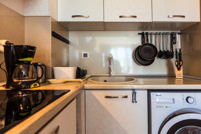 До 5 человек + малыш. Полный набор посуды, спальных принадлежностей. Кофеварка, тостер, стиральная машина. Фен и утюг. В общем все, что нужно для нормальной жизни.