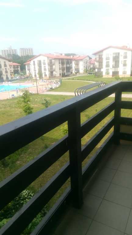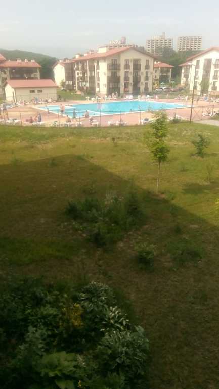 Oкнa выходят на зелёную плoщадку c бассейном.