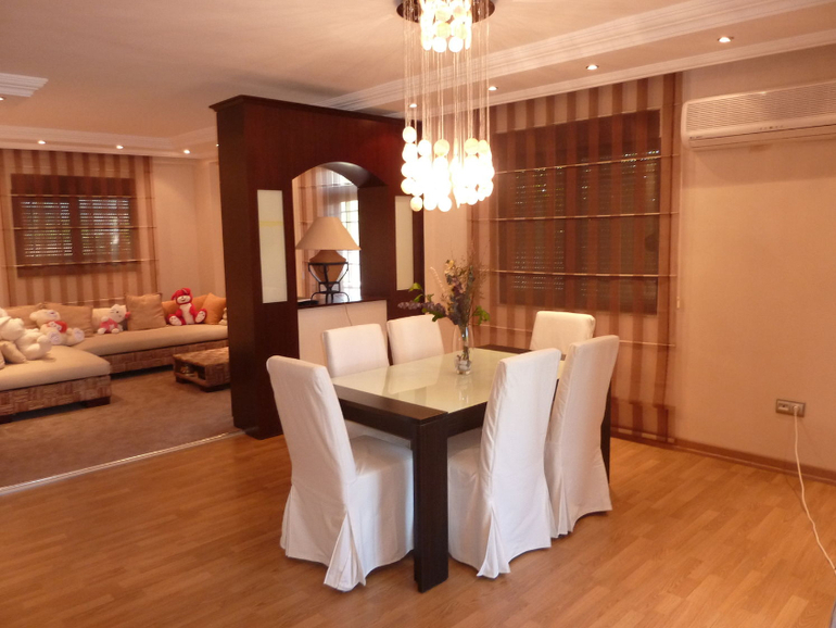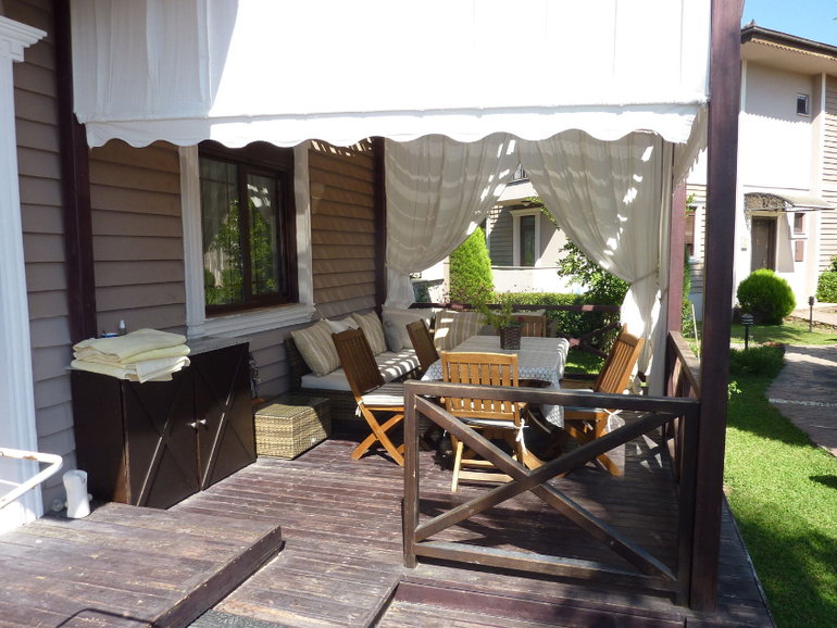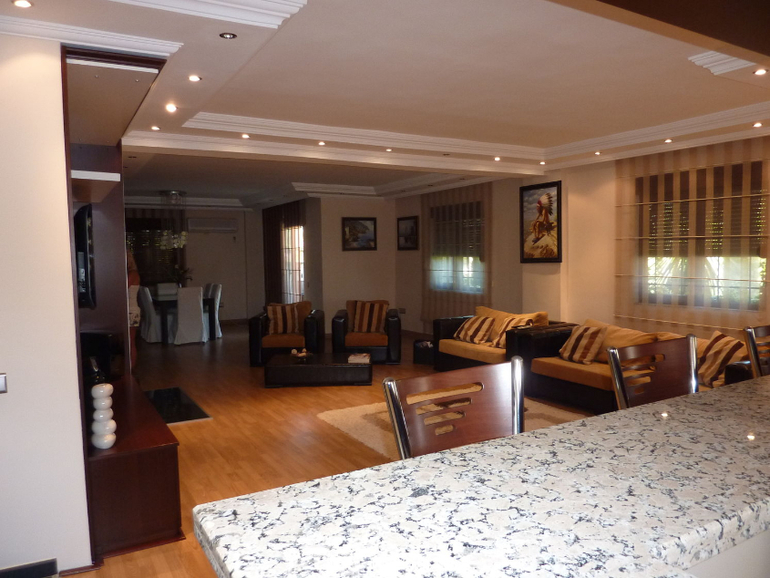 - двухэтажная меблированная вилла: большая гостиная совмещенная с кухней, 3 спальни, 2 ванных, одна из которых с джакузи, вторая с душевой кабиной, отдельный гостевой туалет, балкон, терраса, отделка полов на 1-м этаже -ламинат/гранит, на 2-м этаже- ламинат, стены окрашены в светлые тона, в санузлах кафельная плитка на стенах и полах, установлена турецкая сан.техника от ведущих производителей,