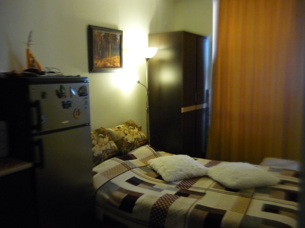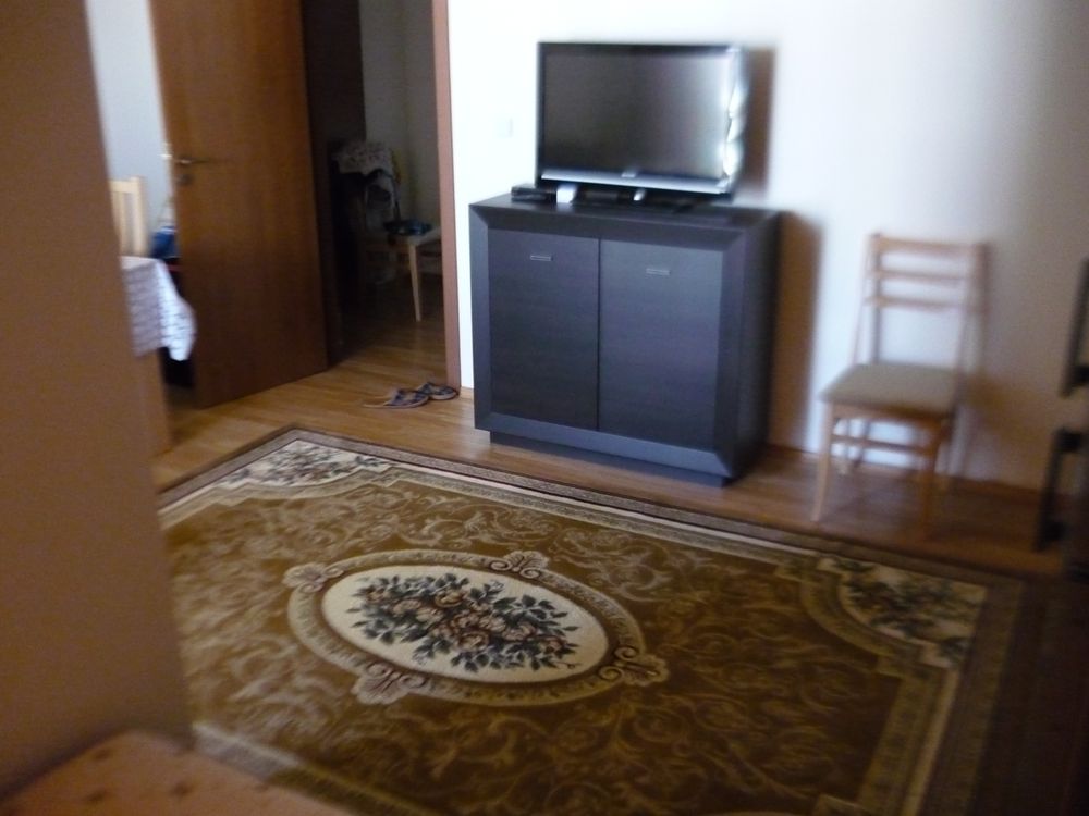 В комнате: двухспальная кровать с прикроватными тумбочками, двухспальный диван , тумба под ТВ, обеденный стол со стульями, комод, мебельный шкаф, большая раскладушка, торшер, пылесос, большой телевизор с русскими каналами.