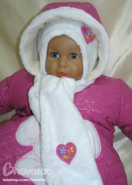 Цвет мне очень понравился, я прямо чуть не плакала. Здесь отделка на шапочке немного другая, а там был такой пушистый белый цветок сделан меховой на шапочке и шарфике. Еще туда входят пинетки белые и такие царапки беленькие на ручки....По-моему, очень красивый....И, главное, я такого больше не видела нигде....
