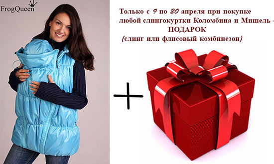 Только с 9 по 20 апреля 2013 года при покупке любой демисезонной слингокуртки ТМ Царевна Лягушка (Коломбина, Коломбина Thinsulate и Мишель) Вы получаете в ПОДАРОК (слинг с кольцами Гусленок или май-слинг MINIZONE или трикотажный слинг-шарф или флиосвый комбинезон или футболку для кормления или слинго-сумку или шапку-шлем или многоразовый подгузник для малыша).