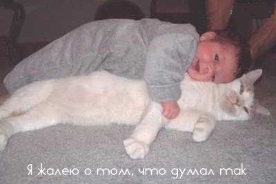 Ситуация такая) У меня дома живёт собака, 2 кошки и самый любимый кот на свете!) Чисто мой мальчик... У нас с ним какая-то космическая связь, которая никому не понятна)) Он самый необычный кот для меня)) С младенчества выбрал себе хозяйку и больше никого не слушается) Даже зраки у него всегда круглые, как у человечка) Очень ласковый, добрый, но... очень ревнивый! Ревнует меня ко всем, недовольно рычит, когда ко мне кто-то подходит и прикасается) Считает, что я только его женщина!) Отношусь к нему не как к коту, а как к очень важному члену семьи, как к ребёнку своему)) Сейчас он постоянно трётся о мой животик, песенки ему поёт)) Так мило, я боялась, что он не поймёт, что со мной за фигня происходит))) И вот, собственно, в чём вопрос... Я боюсь его реакции на уже родившегося ребёнка... Как вы знакомили своих животных с малышами? Боюсь, что получится что-то вроде этого =DD