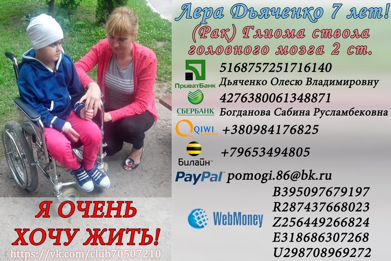 Прошу Вас о помощи! У дочки страшный диагноз - глиома ствола головного мозга.Я Леру воспитываю одна и мне сейчас очень тяжело принять эту ситуацию, не только материально, но и морально. До болезни Лерочка была очень светлым ребенком, как лучик солнца освещала все вокруг, а как красиво она поет. Эта маленькая девочка перенесла в своей жизни очень много боли , борясь за свою жизнь каждый день. Она сильная девочка и старается бороться ради своей мамы, но чтобы встать на путь здоровой жизни ей нужно получить дорогостоящее лечение за границей, а у меня средства исчерпаны.