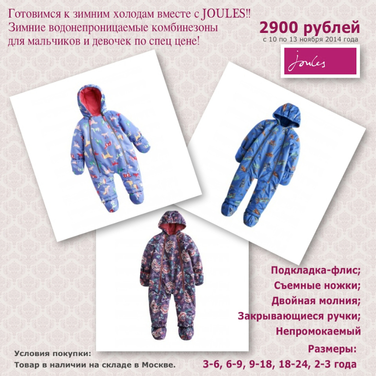 Специальная цена - 2900 рублей на зимние водонепроницаемые комбинезоны JOULES (размеры от 3 месяцев до 3 лет)