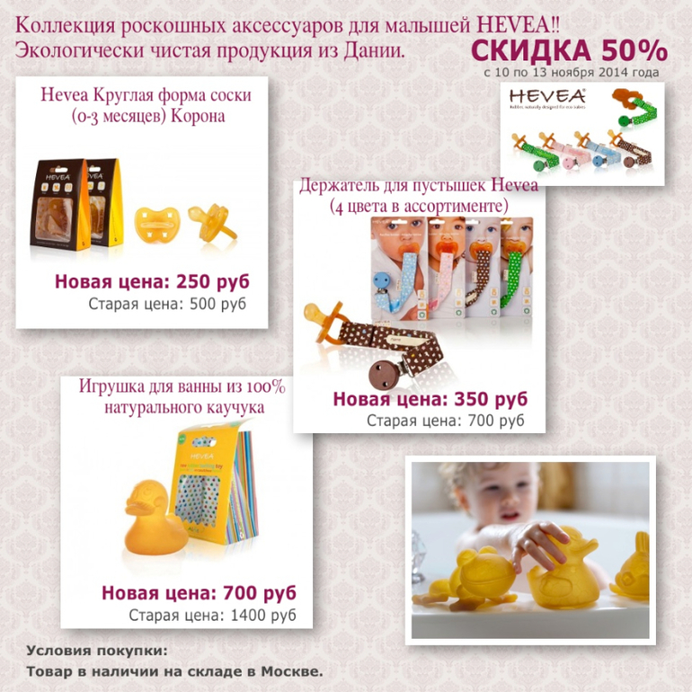 Скидка 50% - аксессуары для малышей HEVEA (пытышка round 0-3 мес, держатели для пустышки (4 цвета), игрушка для ванны Уточка)
