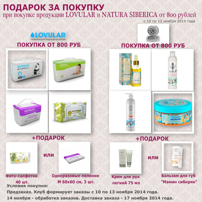 ПОДАРКИ за покупку! При покупки продукции LOVULAR и NATURA SIBERICA от 800 рублей!