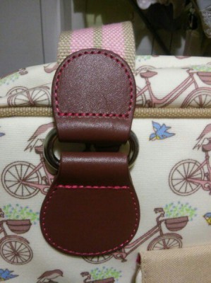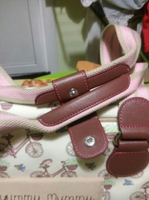 К сумочке прилагается длинный ремень. Он пристегивается на карабины и позволяет вешать сумочку на коляску.