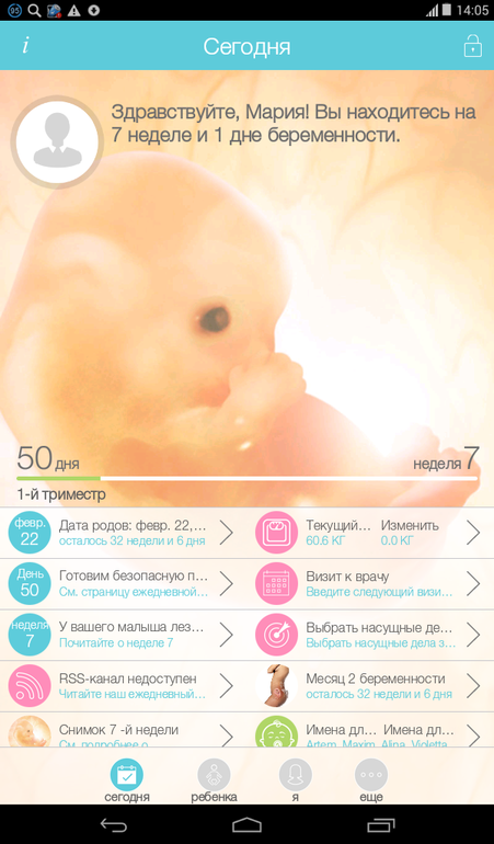 у меня нет такого приложения)Сегодня у нас:12 июля 2015 г 12:02:22, воскресеньеДень последней менструации8 марта 2015 г., воскресеньеПредполагаемая дата родов12 декабря 2015 г., субботаВашему малышу уже4 месяца 4 дня 13 часов 2 минуты