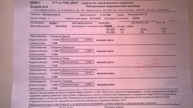 Всем не ровнодушным привет)Всем кто вчера меня поддерживал,успокаивал,помогал советом большое спасибо!Сегодня сходила к врачу,пока ждала своей очереди представляла как зайду и на ору на нее,но когда зашла и увидела результат то у меня так поднялась настроение что я и забыла про это!Мне кажется такой результат не должен вызывать такой паники да и я не одна была там,были девушки точно с такими же анализами,походу они просто не научились пользоваться к генетику я не поеду,не хочу лишний раз себя тревожить!А на УЗИ я записалась в другой город!Я ЛЮБЛЮ СВОЕГО МАЛЕНЬКОГО АНГЕЛОЧКА И БУДЬ ЧТО БУДЕТ!Врачу у меня доверия нет,она тупо сидела улыбалась нас там было 2е с одинаковым диагназом в кабинете.Так что я буду надеяться только на лучшее.А ВСЕМ У КОГО ПОХОЖАЯ СИТУАЦИЯ СКАЗУ,как вы сами будете думать так и будет!Я думаю у меня и у малыша все будет хорошо!ВСЕМ СПАСИБО!А и фото моих анализов кому интересно.