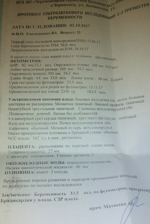 АнализыДоброго времени суток. Девочки помогите пожалуйста разобраться с Узи... Подруга прислала свои результаты, с 12.09 по данным УЗИ размер головы ребенка УМЕНЬШИЛСЯ😵, срок поставили меньше, врач предположил что ребенок не растет, но по весу и размерам других частей тела, прибавка явно есть. Сердцебиение 160уд но ставят брадикардию плода. Но меня больше удивило показание вод, всего 40мм, разве это норма? Заранее спасибо всем откликнувшимся. Подруга в панике, я в другом городе сейчас, не знаю как и успокоить. Фото Узи прилагаю