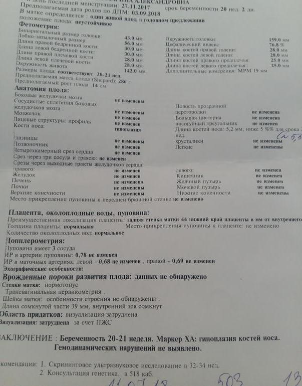 Сходила на второе УЗИ. Так вот всё вроде бы хорошо, кроме косточки носа. Она короче, чем надо по их таблицам. У нас 5,2, а минимум - 5,5. Поставили гипоплазию. На прошлом УЗИ - кость вообще не нашли ☹️ Перечитала весть интернет, кто пишет, что будет просто носик - курносик, а единицы пишут, что это всё-таки маркер хромосомных нарушений. Кровь у меня в порядке, других отклонений нет. Направили в тот же день к генетику - она сказала, что беспокоиться не о чем. Но мой беременный мозг не может воспринять эту информацию и я всё-равно переживаю! 😰 Вообще ещё в тот день после меня к генетику толпа собралась из девочек- будто УЗИ у многих показало не правильно. Не знаю как на самом деле.