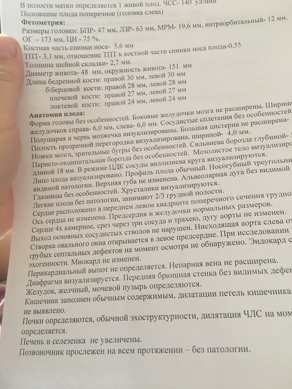СкринингВсем привет. Напишу и в этот раздел бб.Вообщем первый скриннинг был хорошим.Риски 1:13000 ТВП 2.1( может и много) носовая кость +Второе УЗИ в 19 недель 3 дня ( сразу скажу срок мне считают акушерский по УЗИ т. К цикл не регулярный)Вроде все нормально все соответствует НО в заключении написано нерезкое укорочение бедренных костей. Врач говорит ничего , потом на следующем узи посмотрим может догонят. Но придя домой я конечно полезла в интернет и начиталась про синдром дауна (((Гинеколог направила к генетику.Для себя я сдала кровь а там риски пришли 1:1912 вроде это не большой риск но мне кажется осень даже не маленький тем более в сравнении с первым скриннингом! Вообщем иду на 3д УЗИ в 20 недель и 3 дня Результат длинна бедренных костей 30ммДлинна носовой кости 5.6.Врач ничего не говорит в заключении ничего не пишет плохого. А я дома читаю что это ниже нормы!!!Девочки у кого какие размеры были на таком же сроке?