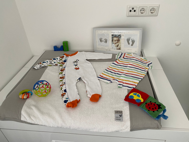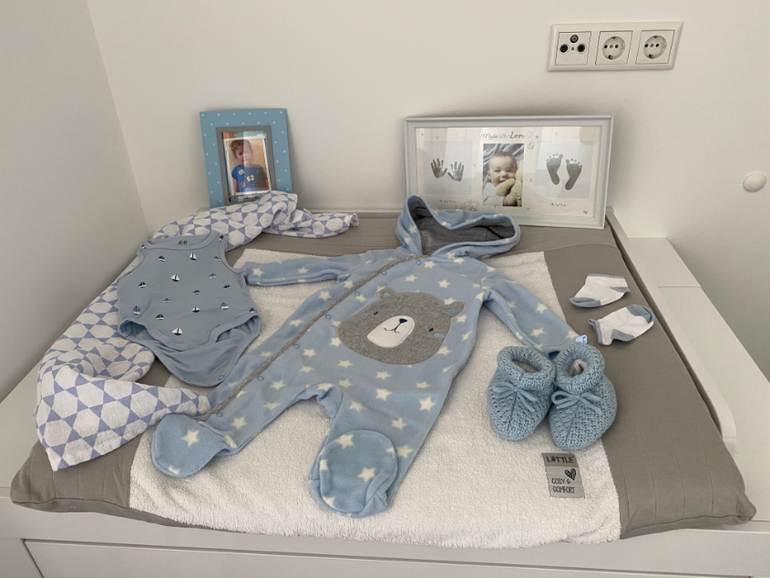 Ну и пеленальник с разной одежкой на нем (это я сегодня баловалась, не удержалась!) и рамочкой для отпечатков ножек и ручек: