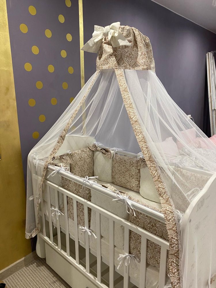 Мы для племяшки покупали спальный комплект из 18 предметов бренда амаробейби, в комплекте есть и балдахин и 12 подушек-бортиков, нежный материал, не вызывает аллергию, при стирки не садится, красивый)))