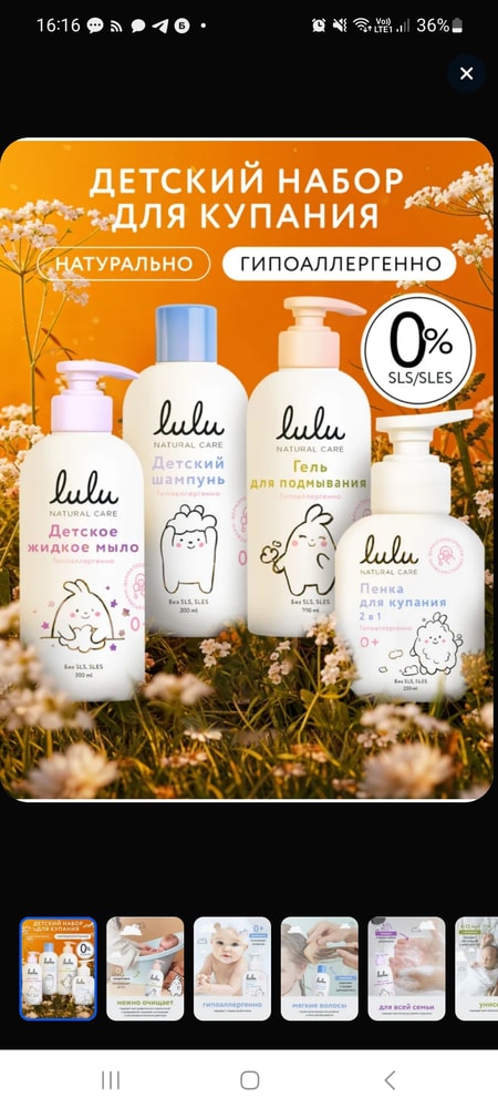 Я купила от Lulu молочко детское для тела и соедство для купания 2в1. Пахнет все классно. Состав вроде ок тоже. Жду вот пользователя😅