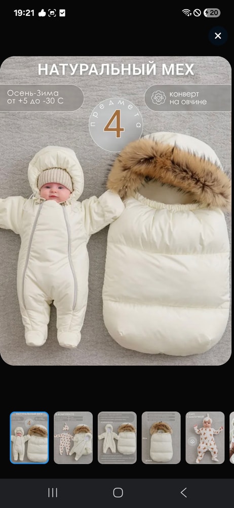 Пробовала заказывать на озоне комплект не из дешёвых(7500 руб), но когда он пришёл появились сомнения, сам конверт очень теплый на овчине, но комбез показался тонким и очень маленьким(56 размера) которого едва хватит на месяц носки и ребёнок вырастит из него.