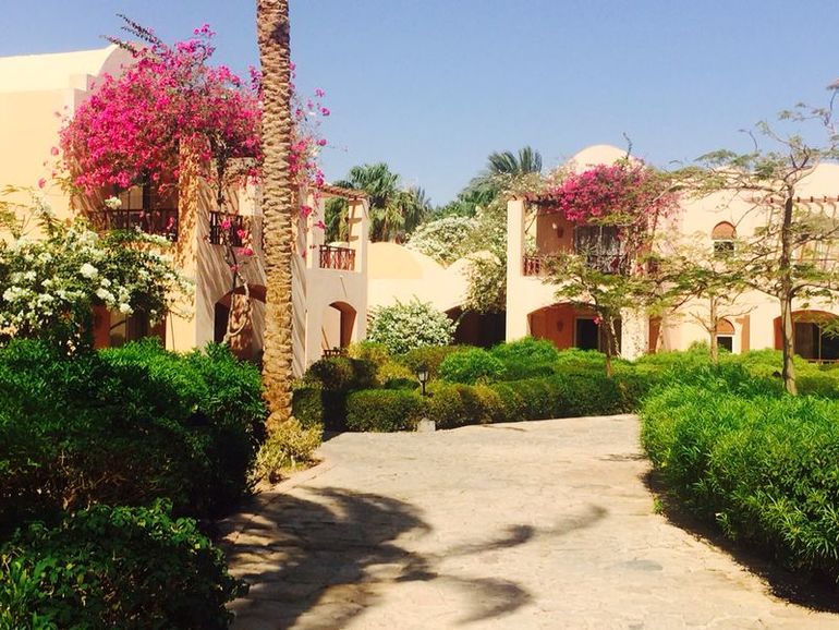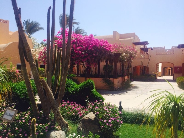Дорога до моря меня лично ни капельки не напрягала. Идти до моря максимум 5 минут с детьми. Есть 2 пути: По специальной дорожке с надписью BEACH, дорожка в тенечке от крыши из цветущих растений; через отель Iberotel Makadi Beach 5*. Второй вариант по расстоянию меньше, но интереснее, поэтому дольше)) Кусты, постриженные в форме динозавров, красивые растения, кактусы, цветы)