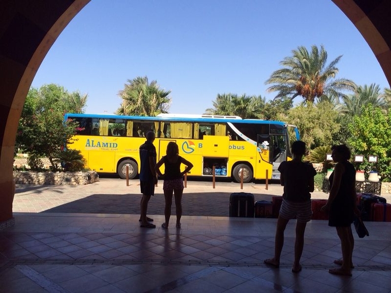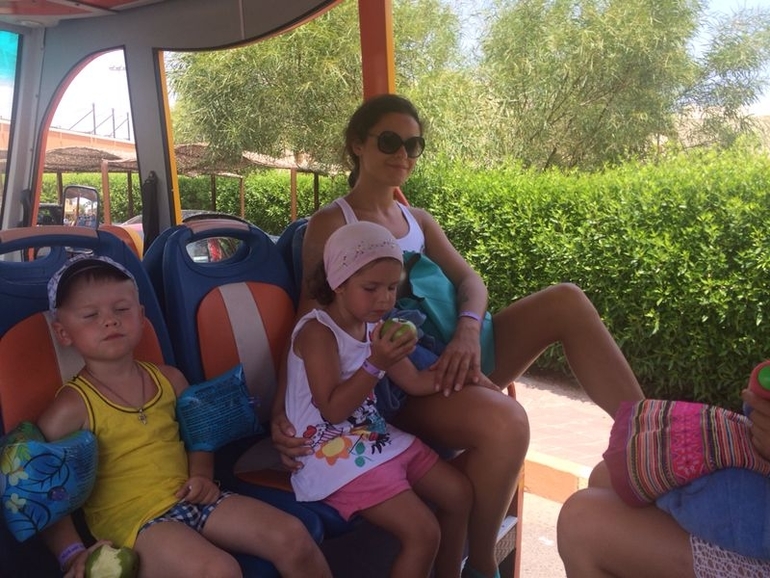 От отеля каждые 15 минут ходит оранжевый открытый автобусик в аквапарк))