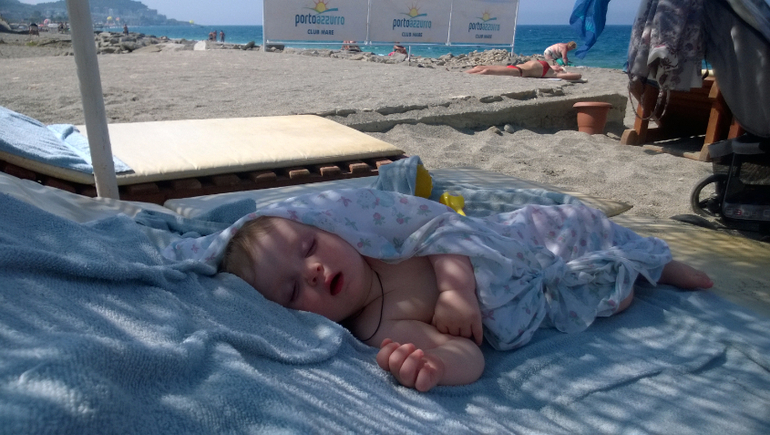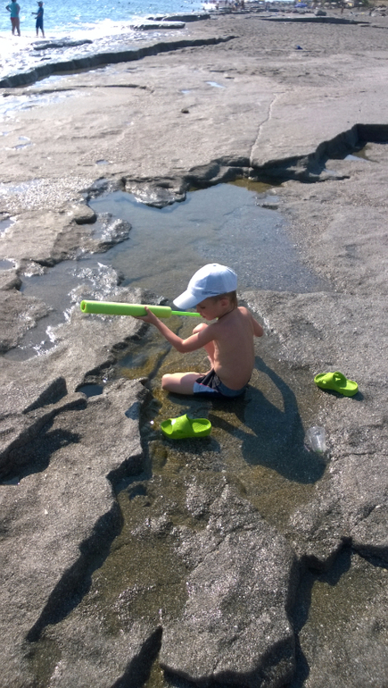 По приезду два дня был сильный ветер, и мы не купались (и еще по одной причине, про неё ниже), ходили только смотреть на морюшко))))) Потом погода наладилась. Море было теплым, с не большими волнами. Со старшим катались на волнах, собирая в плавки камешки