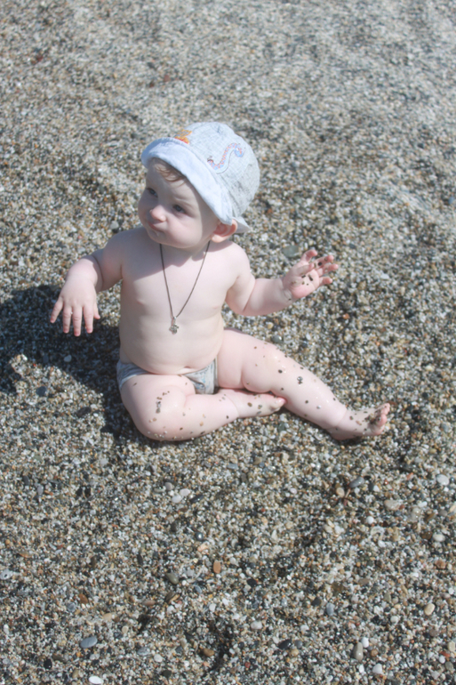 . Пляж - очень мелкая галька и большие плиты, вход в море между ними. На самих плитах образованы маленькие ниши, туда волнами заливается вода и в них плещутся все детки, водичка теплее чем в море, нагревается солнышком)))) Старший на пляже занимался собирательством : искал алмазы, изумруды и янтарь (кусочки стекла обточенные морем) Привезли домой целое состояние!!!