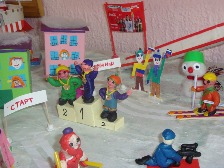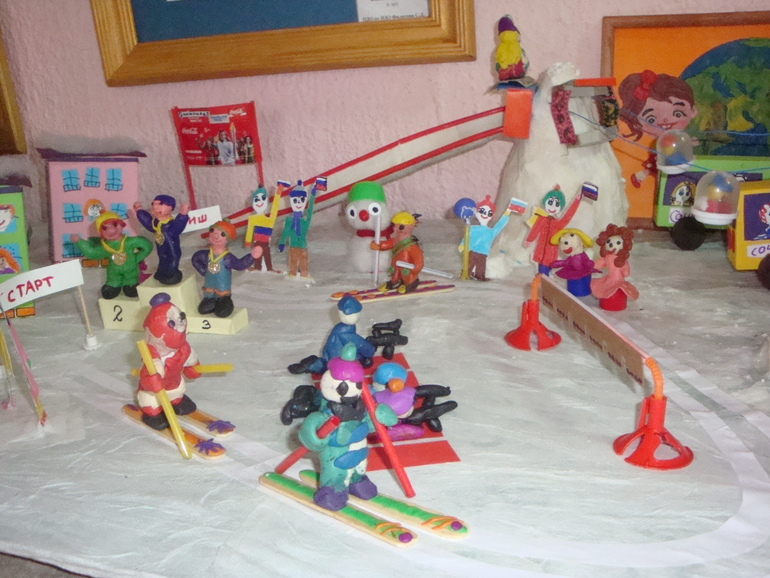 можно лыжника из пластилина слепить... а можно пьедестал из соленого теста, а на нем каких-нибудь зверушек...
