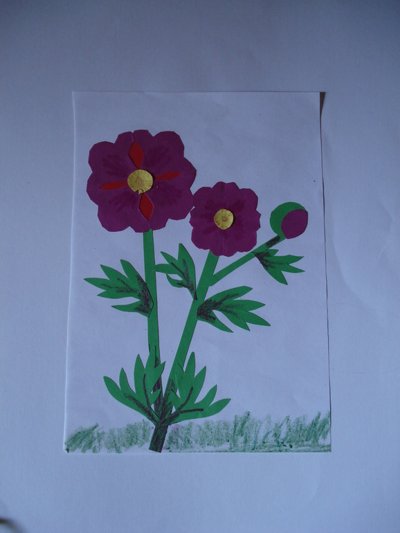 1. Аппликация из цветной бумаги и салфеток "Пионы".