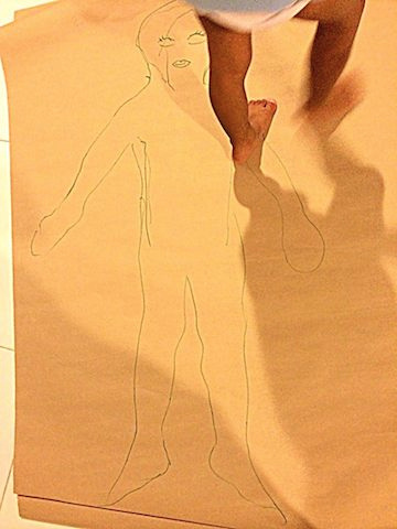 Ну и мы решили начать. Сначала Ти не давался, пришлось мне падать на пол. но потом и его, хохочущего удалось кое-как обвести. А потом - разрисовывали, клеили, лепили )) весело ))