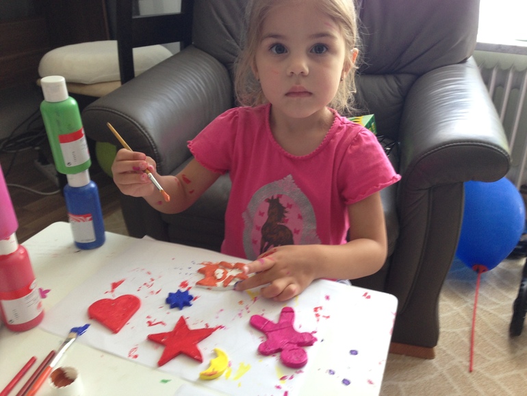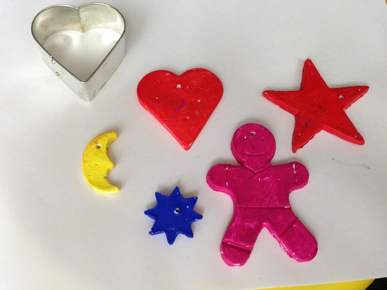 Из самозатвердевающей глины дочь раскатала лепешку, и формами для печенья выдавила различные фигурки. В каждой фигурке я сделала дырочку зубочисткой. После высыхания на следуючий день Аылинка раскрасила фигуры акриловыми красками. Мы планируем повесить их через дырочку (сделанную зубочисткой) на ленточки и потом на красивую ветку, что-то типа Мобиля-подвески. Вот только из-за дождей никак не подыщем подходящую ветку.