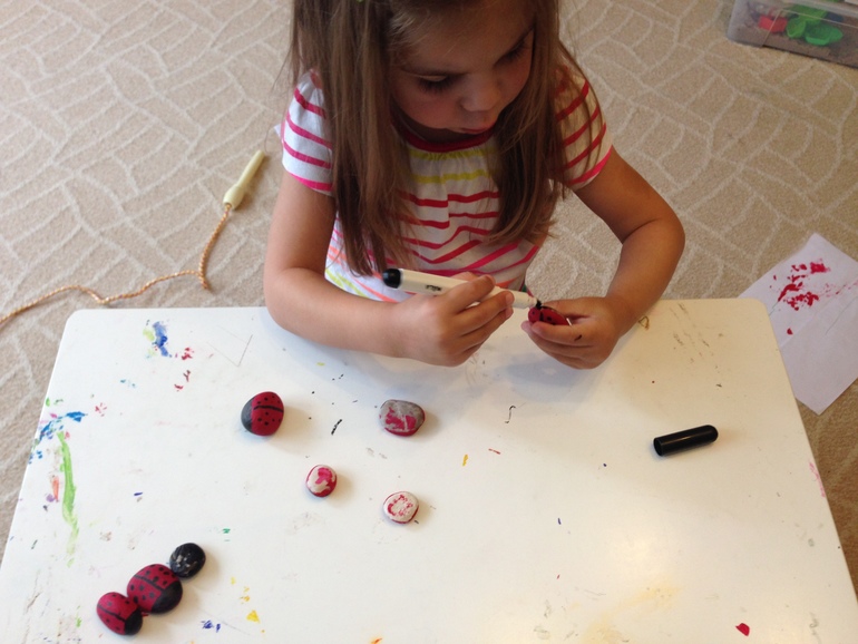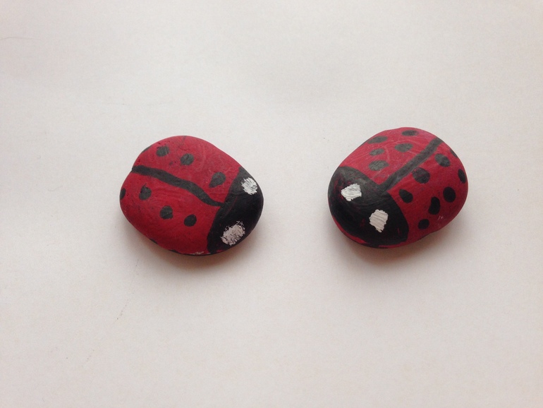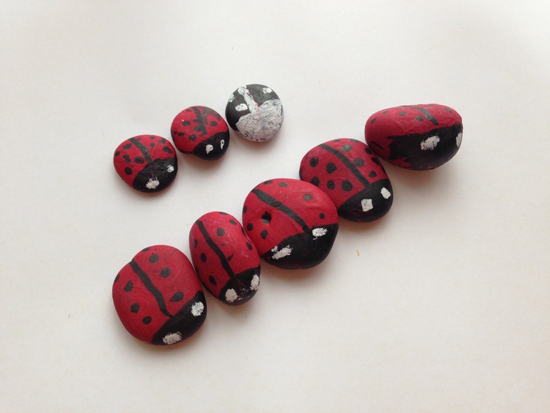 Жучки-Божьи Коровки. Собирали на улице камни (уже само это занятие доставило море удовольствий: рыться, выбирать, решать подойдет или нет, а потом дома раскрасили их красками и фломастером. Дочурка их тоже очень любит, играет с ними, поделила их на детей, мам, пап, баушка с дедушкой, так что у нас целое семейство.