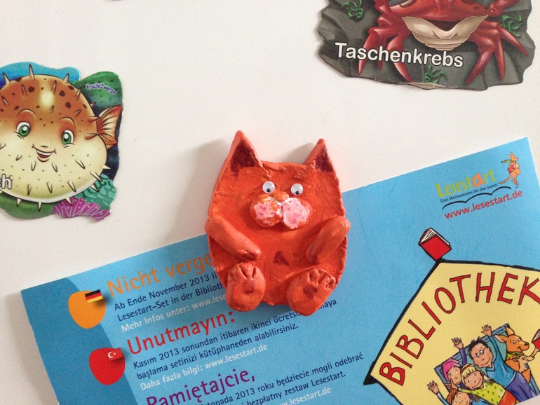 А из этого зверя решено было сделать магнит на холодильник. Просто на обратную сторону приклеили магнитную пластинку. Хотели подарить бабушке, но дочке так понравился кот, что пришлось оставить себе. Корявенький, зато своими руками.