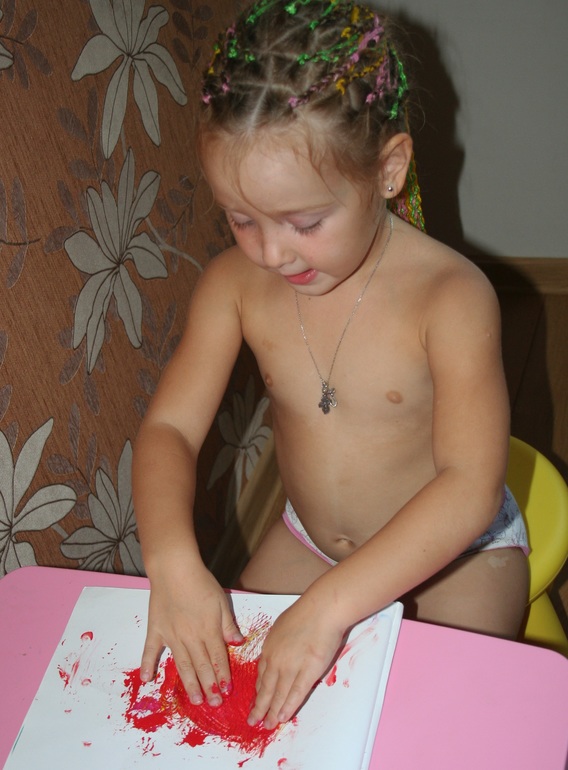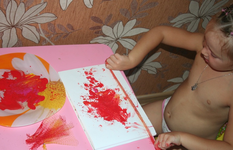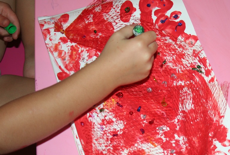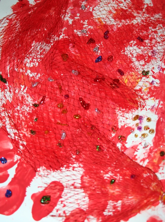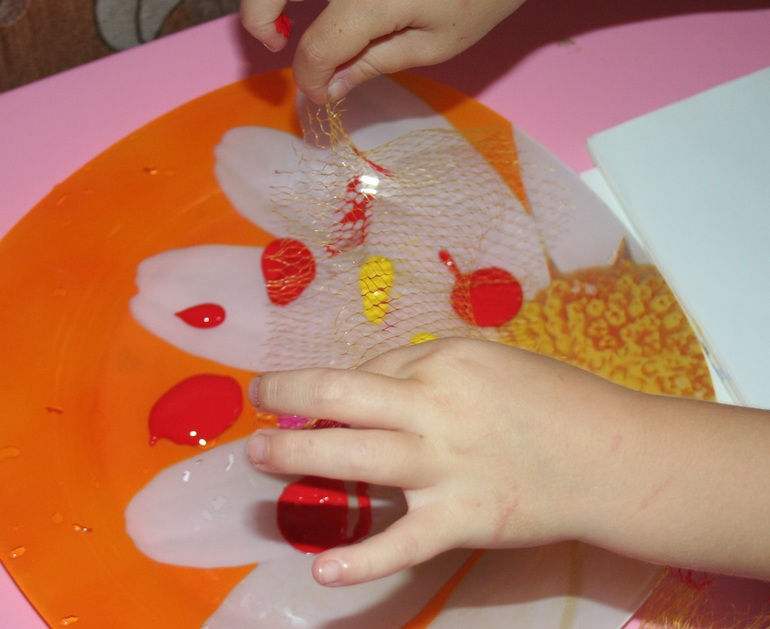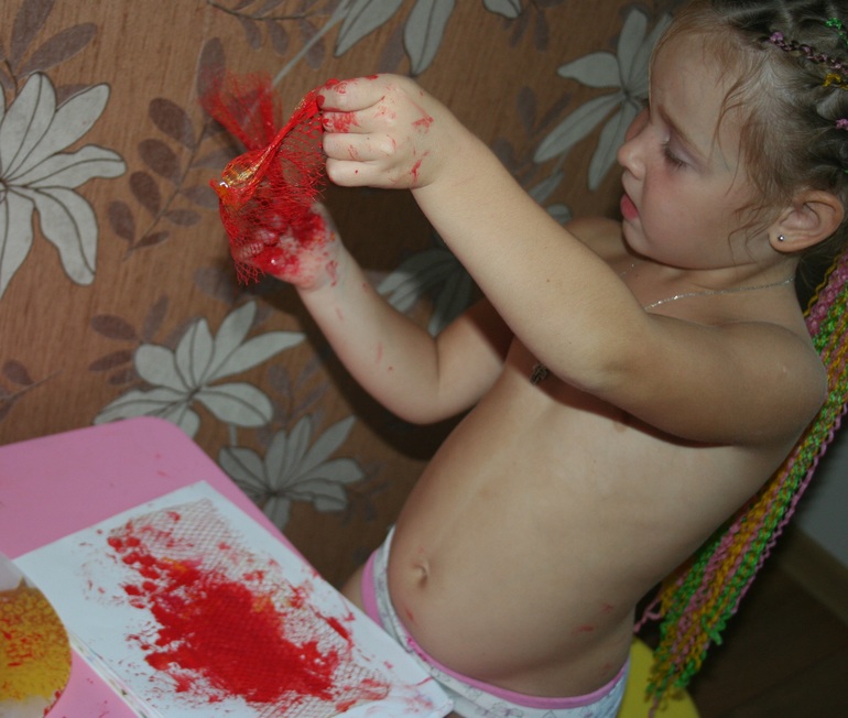 А когда вся краска была использована, и сетка из желтой стала - красной, было принято решение приклеить ее к нашему рисунку. Дочка разложила кусочки по своему вкусу, а я зафиксировала их клеем ПВА.