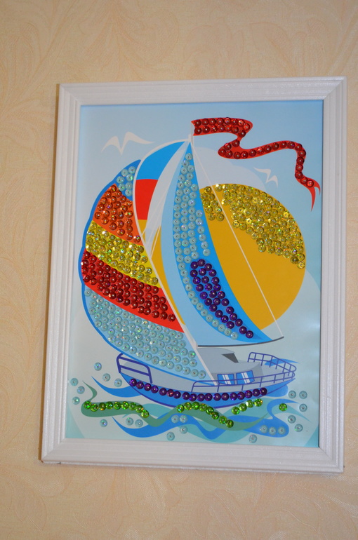 Делюсь впечатлениями. Набор рассчитан на детей от 4х лет, Но на мой взгляд, не раньше 5-ти. Достаточно сложно для 4х летки взять пайетку и наколоть ее гвоздиком на шаблон. В основном работу делала я, дети только заталкивали гвоздики пальчиками. И то каждый раз приходилось напоминать, что гвоздик должен заходить строго вертикально.