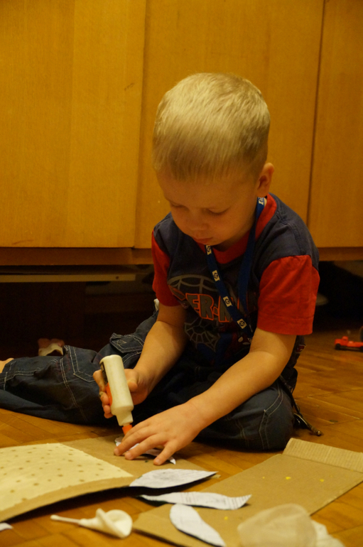 Вчера сынок сказал, что хочет сделать подарок воспитателю. Выбрали поделку и быстренько сделали. Почти все делал сам! Я немного помогала с поклейкой цветов и украшением букета. Устал очень! Под конец, при оформлении рамки, уже с трудом концентрировался. Но все равно, справился сам!