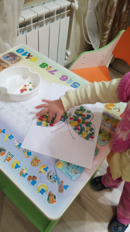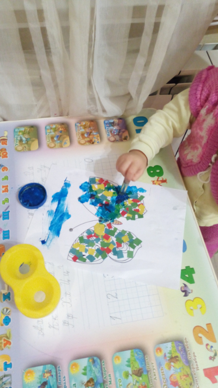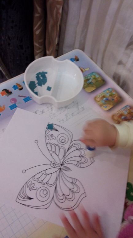 В общем мы все-таки отстали от карандаша с клеем и разместили кусочки цветной бумаги по бабочке, она стала такой красивой))) просто загляденье)))