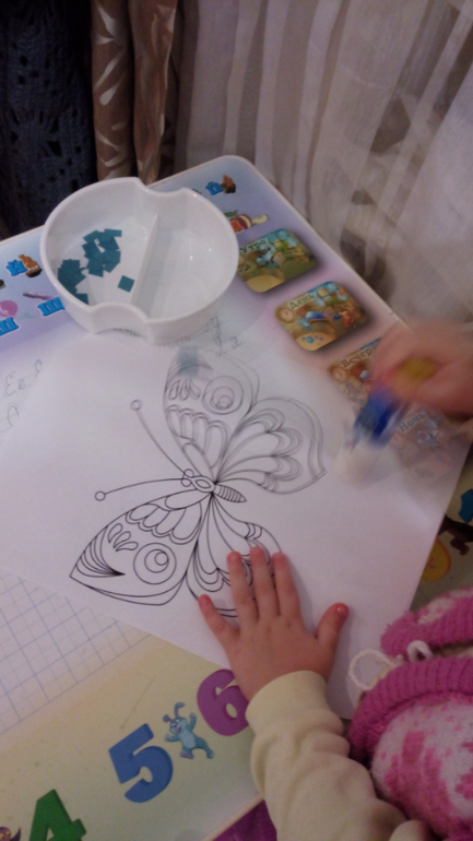 Затем стали приклеивать кусочки цветной бумаги на бабочку... но вдруг оказалось, что нужно еще клея пару слоев нанести...))))))