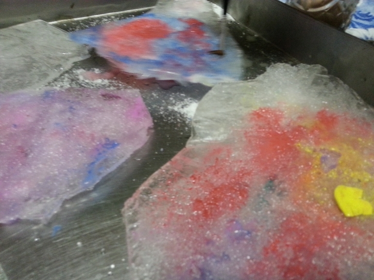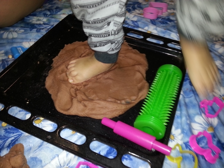 В гости к бабушке все игрушки не привезешь, тем более если она за 700 км... поэтому спасались чем могли Рисовали на кусках льда(взяли возле дома на речке), делали домашний пластилин с какао, в ход пошел гидрогель, и вместе с пластилином, и ногами (у нас вообще страсть к рисованию ногами), рисовали штампами из картошки и пальчиковыми красками в мультифоре.