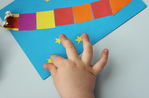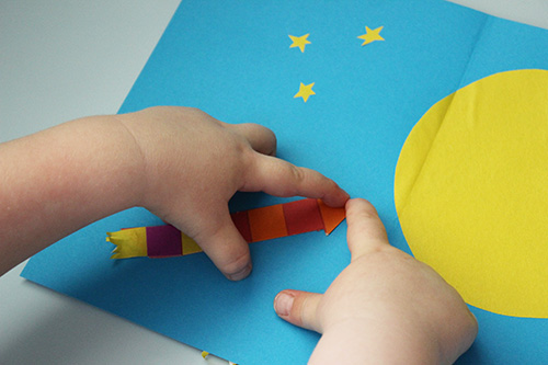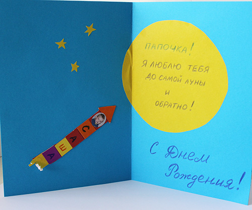 И тут начинается все самое интересное: вырезала из цветной бумаги круглую луну (приклеили вместе), Саша приклеил звезды и отдельно я сделала шаблон маленькой ракеты, вырезала (копия той, что на главной страничке) Саша приклеивал ее сам.