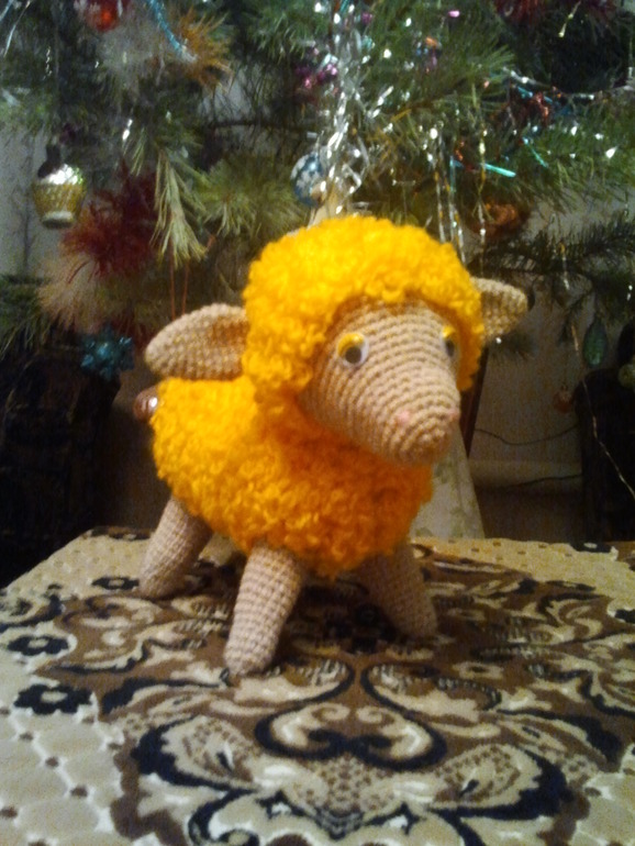 А этого барашка связали уже на каникулах. Вязала я, а дети активно помогали набивать, ну и советы давали. Кстати, Оля, глядя на меня, понемногу освоила вязание крючком, и сейчас пытается связать себе варежки.