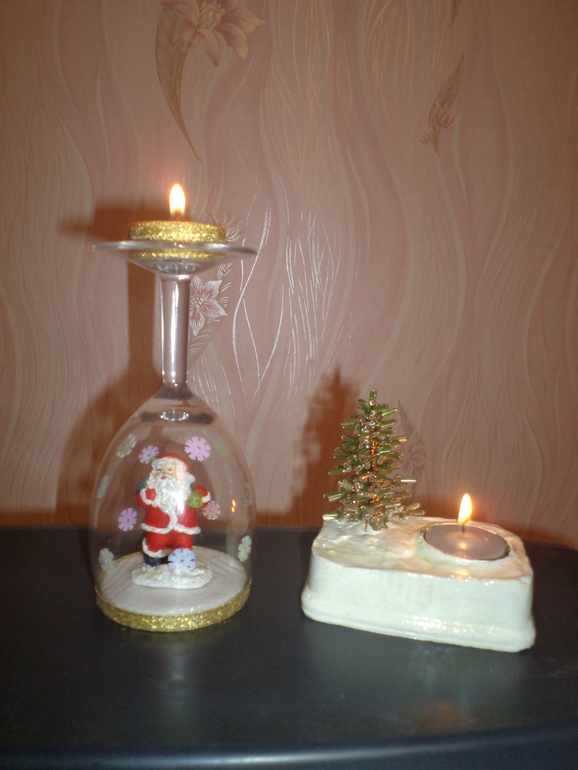 Во первых - это новогодние подсвечники "Елочка" и "Дед Мороз". Делали вместе с дочкой, сынок был в качестве наблюдателя. Успели как раз к празднику, зажгли в новогоднюю ночь.